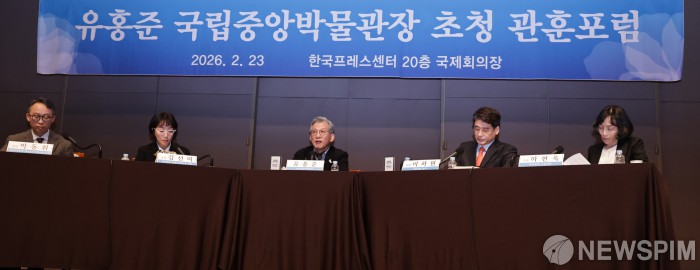 [서울=뉴스핌] 양윤모 기자= 유홍준 국립중앙박물관장이 23일 오전 서울 중구 프레스센터에서 열린 관훈토론회에 참석해 취재진의 질문에 답변하고 있다. 2026.02.23 yym58@newspim.com