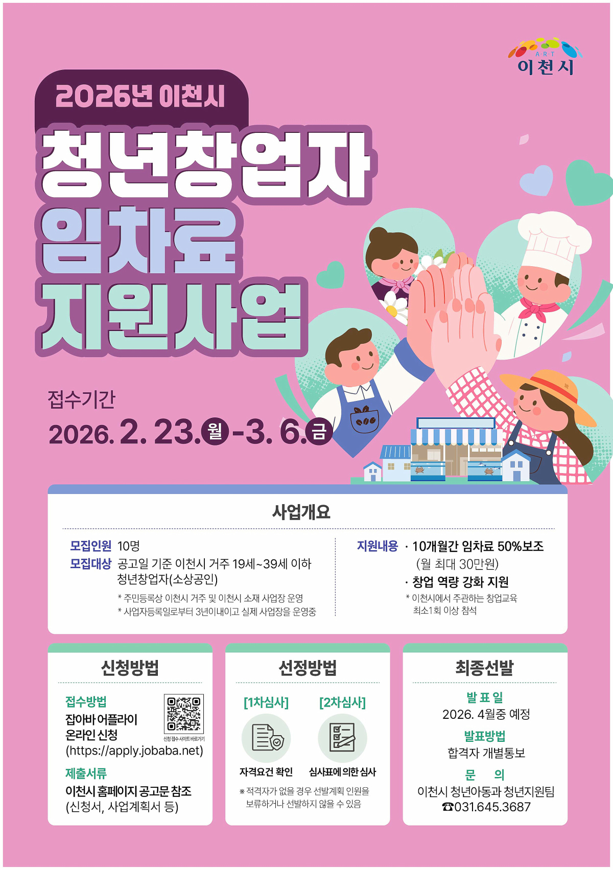 지원 대상은 공고일 기준 19세 이상 39세 이하 청년 소상공인으로 이천시 거주 및 지역내 사업장 운영, 사업자등록 3년 이내 창업자 요건을 모두 충족해야 한다.