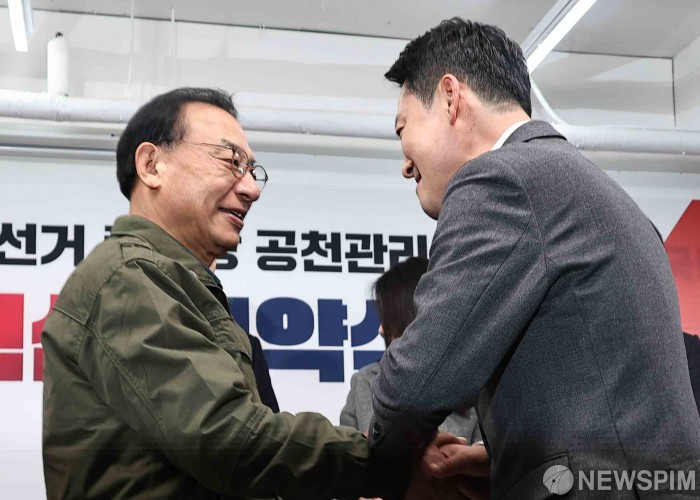 [서울=뉴스핌] 윤창빈 기자 = 장동혁 국민의힘 대표, 이정현 국민의힘 중앙당 공직후보자추천관리위원장이 23일 오후 서울 여의도 국민의힘 중앙당사에서 열린 제9회 지방선거 중앙당 공천관리위원 서약식에서 악수를 하고 있다. 2026.02.23 pangbin@newspim.com