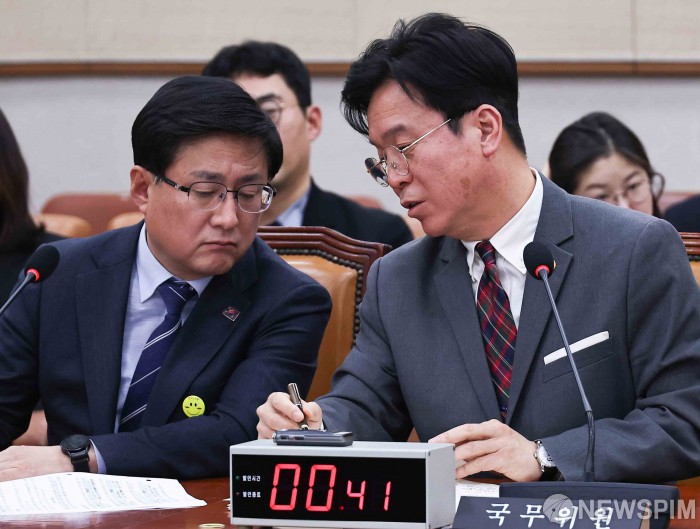 [서울=뉴스핌] 윤창빈 기자 = 김영훈 고용노동부 장관, 김성환 환경부 장관이 23일 오후 서울 여의도 국회에서 열린 법제사법위원회 전체회의에서 대화를 나누고 있다. 2026.02.23 pangbin@newspim.com