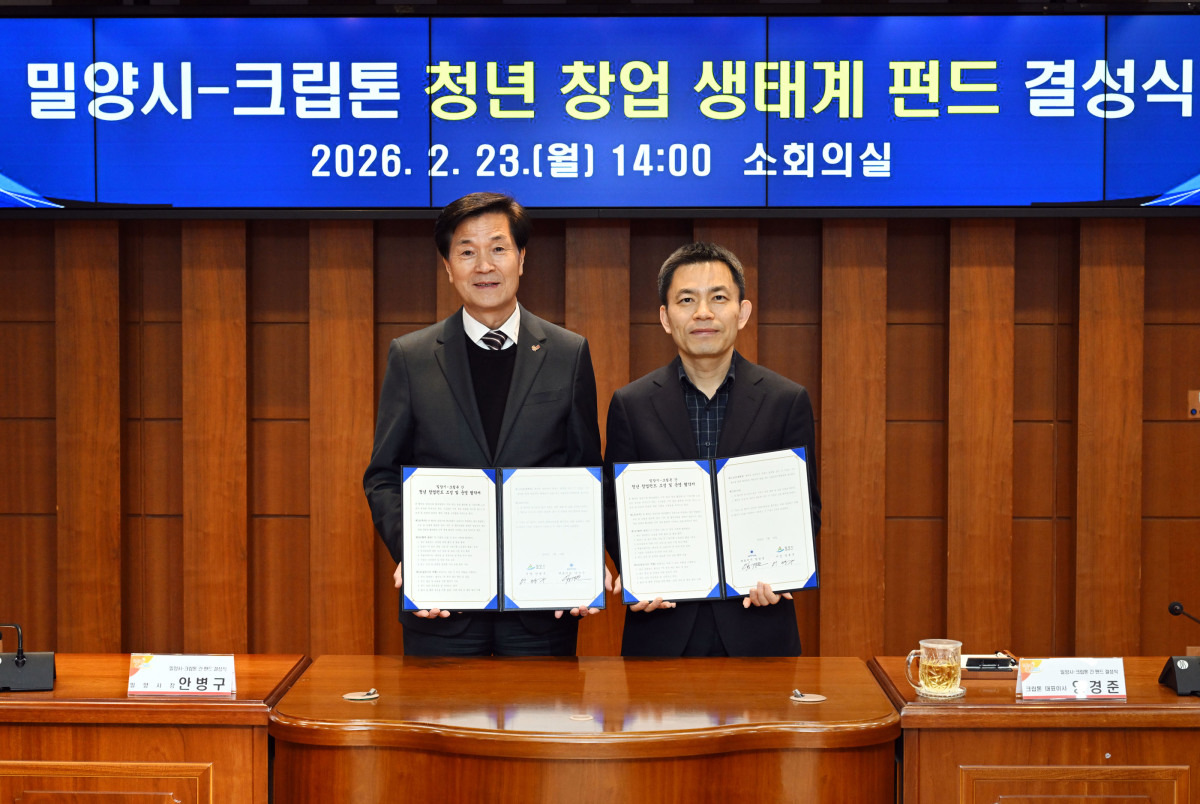 안병구 경남 밀양시장(왼쪽)이 23일 시청 소회의실에서 열린 ㈜크립톤과의 131억1000만원 규모의 '크립톤 지역 창업 생태계 라이콘 펀드' 결성식에서 기념사진을 찍고 있다.[사진=밀양시] 2026.02.23