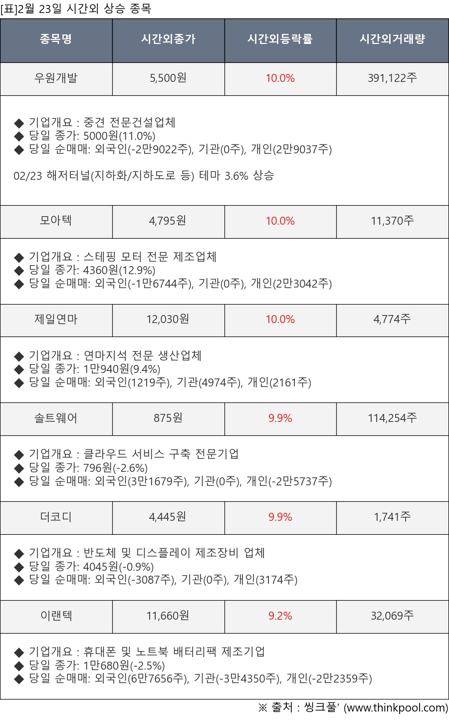 [서울=뉴스핌] 로보뉴스 = 2월 23일, 인공지능 투자비서 ‘AI라씨로’는 시간외 단일가 매매에서 주가가 크게 변동한 우원개발(046940), 모아텍(033200) 등의 최근 동향을 분석해서 발표했다.