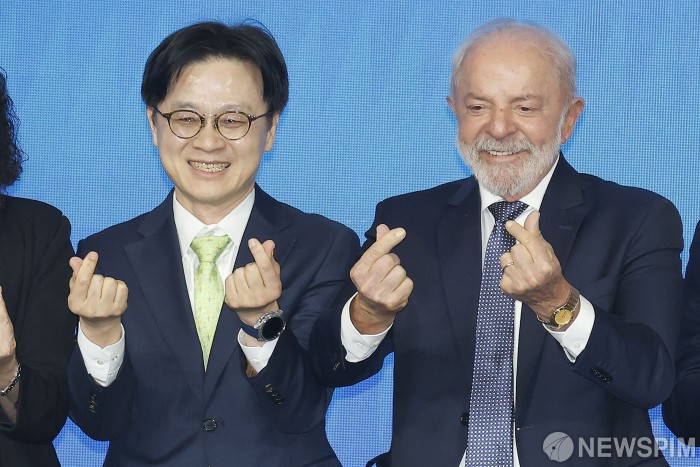 [서울=뉴스핌] 류기찬 기자 = 루이스 이나시우 룰라 다 시우바 브라질 대통령과 김정관 산업통상부 장관이 23일 오후 서울 중구 롯데호텔 서울에서 열린 한-브라질 비즈니스 포럼에서 기념촬영을 하고 있다. 2026.02.23 ryuchan0925@newspim.com