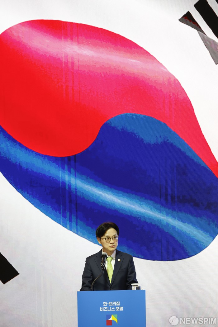 [서울=뉴스핌] 류기찬 기자 = 김정관 산업통상부 장관이 23일 오후 서울 중구 롯데호텔 서울에서 열린 한-브라질 비즈니스 포럼에서 축사를 하고 있다. 2026.02.23 ryuchan0925@newspim.com