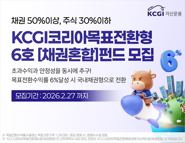 [서울=뉴스핌] 양태훈 기자 = KCGI자산운용은 23일 'KCGI목표전환형6호[채권혼합]'를 모집한다고 밝혔다. 모집 기간은 이달 27일까지다.