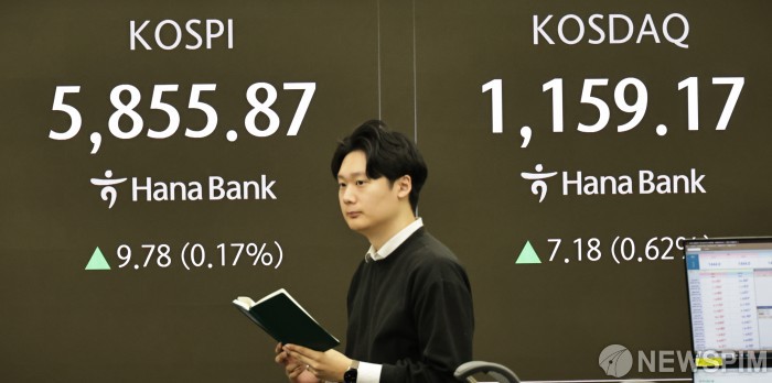 24일 한국거래소에 따르면 이날 오전 9시 4분 기준 코스피 지수는 전 거래일 대비 1.61포인트(0.03%) 오른 5847.70에 거래되고 있다. 기관이 920억원을 순매수 중이며 개인과 외국인은 각각 174억원, 696억원을 순매도하고 있다.