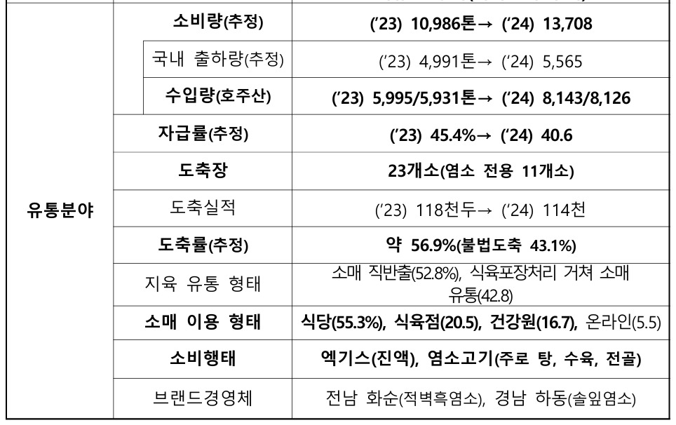 생산 기반 역시 구조적으로 취약하다. 2024년 기준 염소 사육 농가는 1만1474호, 사육 마릿수는 46만9000두로 집계됐다. 농가 수와 총 사육두수는 증가세지만, 호당 평균 사육두수는 40.9두 수준에 머물러 있다. 대규모 전업농 중심 구조가 아닌, 소규모·부업형 사육이 여전히 다수를 차지하는 셈이다.