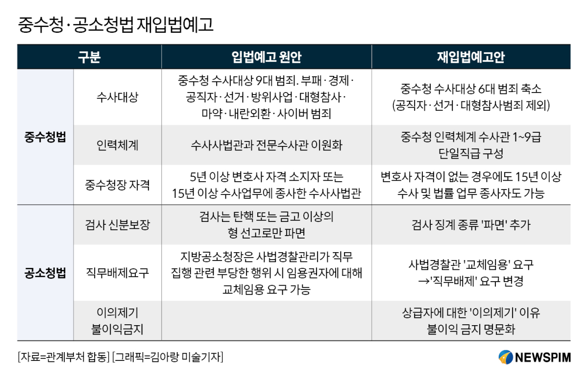 [서울=뉴스핌] 김지나 기자 = 정부가 중대범죄수사청법안·공소청법 수정안을 43일 만에 다시 입법예고했다. 당초 원안에서 가장 논란이 됐던 중수청 인력 체계의 '수사사법관-전문수사관' 이원 구조를 폐지하고, 1~9급 '수사관' 단일 직급 체계로 일원화했다.