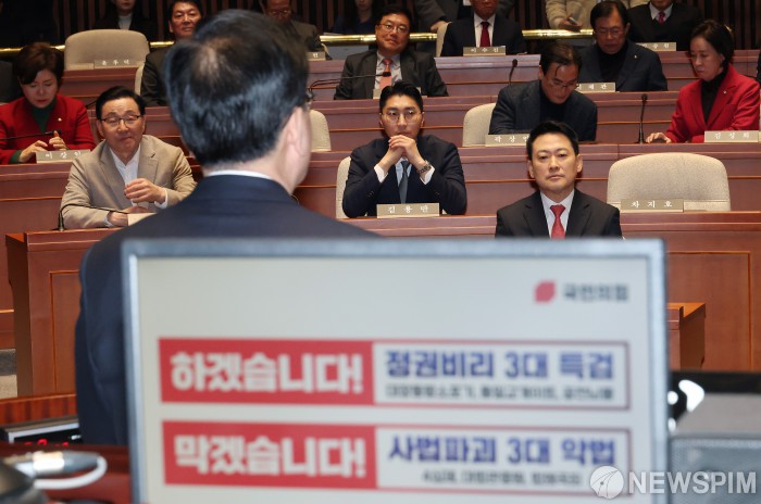 [서울=뉴스핌] 정일구 기자 = 장동혁 국민의힘 대표가 24일 오전 서울 여의도 국회에서 열린 의원총회에서 송언석 원내대표의 모두발언을 경청하고 있다. 2026.02.24 mironj19@newspim.com