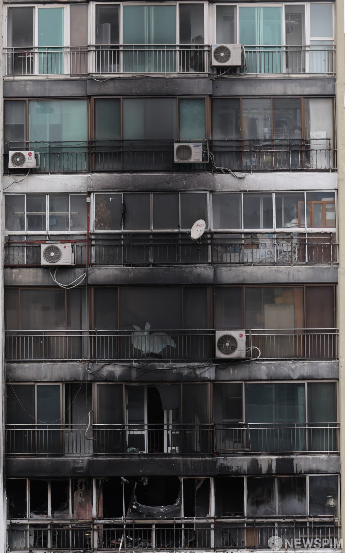 [서울=뉴스핌] 이형석 기자 = 24일 서울 강남구 은마아파트에서 화재가 발생해 외벽이 검게 그을려 있다. 화재로 1명이 사망하고 3명이 부상을 입었다. 2026.02.24 leehs@newspim.com