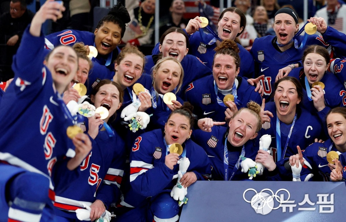 [밀라노 로이터=뉴스핌] 박상욱 기자= 미국 여자 아이스하키 대표팀 선수들이 지난 19일(한국시간) 캐나다와 밀라노 동계올림픽 결승전을 마치고 금메달을 목에 걸고 단체 사진 촬영을 하고 있다. 2026.2.24 psoq1337@newspim.com