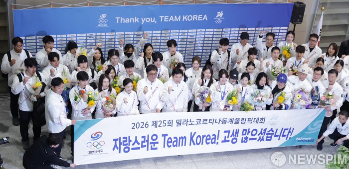 [영종도=뉴스핌] 류기찬 기자 = 2026 밀라노-코르티나담페초 동계올림픽을 마친 대한민국 선수단이 24일 오후 인천국제공항 제2여객터미널에서 귀국 인사를 하고 있다. 2026.02.24 ryuchan0925@newspim.com