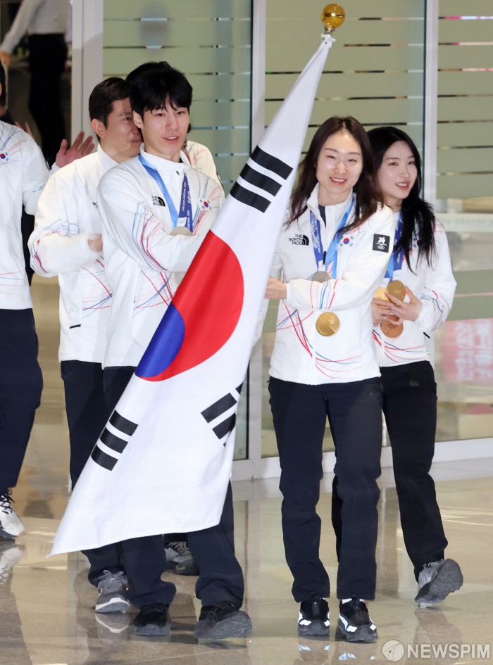 [영종도=뉴스핌] 류기찬 기자 = 밀라노·코르티나담페초 동계 올림픽을 마친 대한민국 선수단이 24일 인천공항을 통해 귀국했다. 황대헌(왼쪽)과 최민정이 태극기를 들고 이동하고 있다. 2026.02.24 ryuchan0925@newspim.com