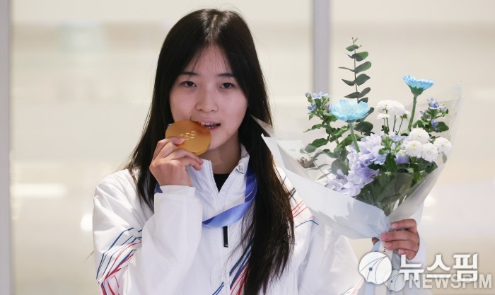 [영종도=뉴스핌] 이형석 기자 = 2026 밀라노·코르티나 동계올림픽 스노보드 하프파이프 금메달리스트 최가온이 16일 오후 인천국제공항을 통해 귀국하며 포즈를 취하고 있다. 2026.02.16 leehs@newspim.com