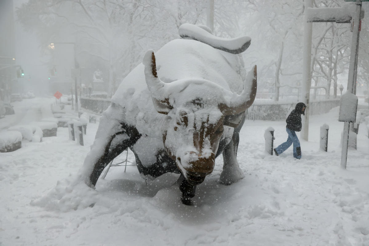 미국 뉴욕 맨해튼 월가의 황소상이 눈에 덮였다.[사진=블룸버그] 2026.02.25 mj72284@newspim.com