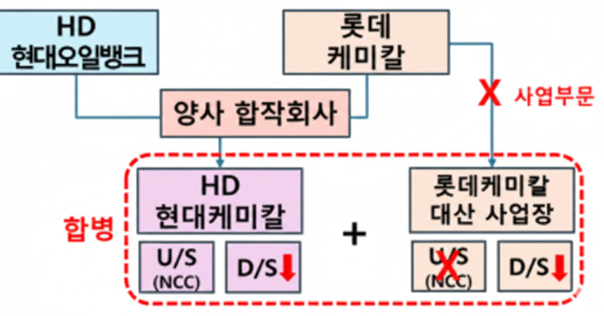 사업재편계획에 따르면, 롯데케미칼 대산 사업장을 분할한 후 현대케미칼과 합병해 NCC 및 다운스트림 설비를 통합 운영한다. 이 과정에서 현대오일뱅크와 롯데케미칼은 주주사 자구노력의 일환으로 통합 신설법인에 총 1.2조원 규모(각 6000억원)의 증자에 나선다.