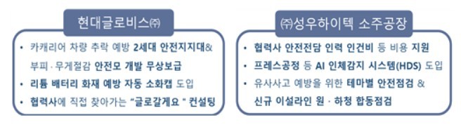 현대글로비스는 협력업체 운전원 의견을 들어 경량 안전모를 보급하고, 작업공간을 넓힌 2세대 안전지지대를 무상 지원해 추락 위험을 예방했다. 리튬 배터리 보관 구역에 열화상 카메라와 자동 소화 설비를 설치하고, 냉난방이 어려운 현장에 에코팬과 기화냉각 쿨팬을 도입한 성과를 인정받았다.