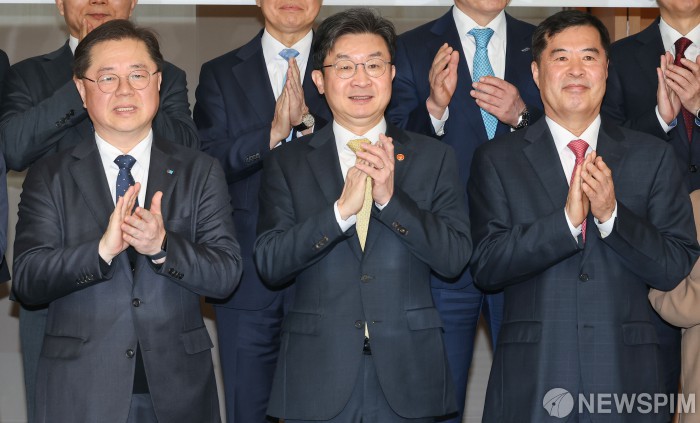 [서울=뉴스핌] 류기찬 기자 = 이억원 금융위원장을 비롯한 참석자들이 25일 오전 서울 중구 대한상공회의소 챔버라운지에서 열린 ‘녹색전환(GX) 지원을 위한 제 4차 생산적금융 대전환 회의’에서 기념촬영을 하고 있다. 2026.02.25 ryuchan0925@newspim.com