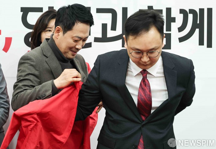[서울=뉴스핌] 윤창빈 기자 = 장동혁 국민의힘 대표가 25일 서울 여의도 국회에서 열린 지역발전 인재 영입 환영식에서 인재로 영입된 정진우 현대엔지니어링 에너지영업팀 매니저에게 당 점퍼를 입혀주고 있다. 2026.02.25 pangbin@newspim.com