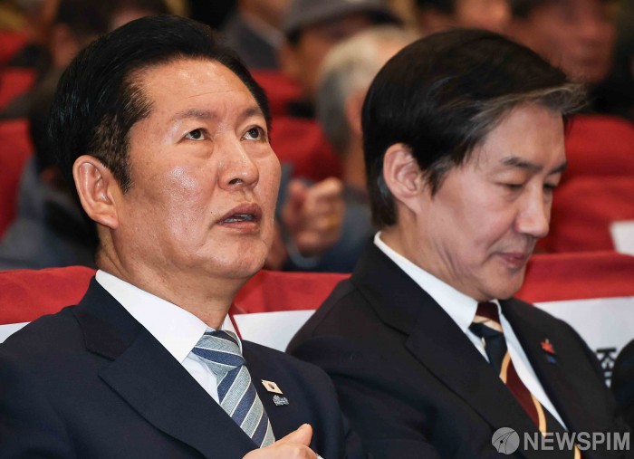 [서울=뉴스핌] 윤창빈 기자 = 정청래 더불어민주당 대표, 조국 조국혁신당 대표가 25일 국회 의원회관에서 열린 5·18정신 헌법전문수록 개헌 촉구 국민결의대회에 자리하고 있다. 2026.02.25 pangbin@newspim.com
