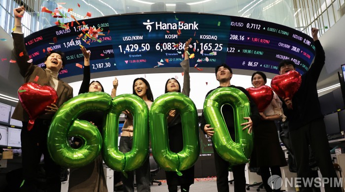 [서울=뉴스핌] 양윤모 기자 = 25일 오후 1980년 코스피 시장이 열린지 46년 만에 사상 처음으로 6083.86으로 마감한 가운데, 서울 중구 하나은행 을지로본점 딜링룸에서 직원들이 축하 세레머니를 하고 있다. 2026.02.25 yym58@newspim.com