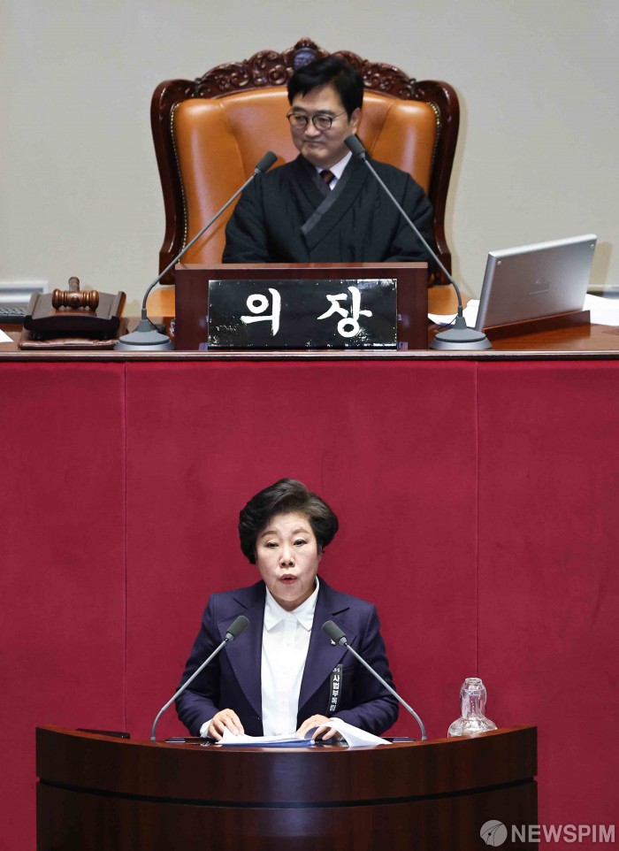 [서울=뉴스핌] 윤창빈 기자 = 조배숙 국민의힘 의원이 25일 서울 여의도 국회에서 열린 본회의에서 형법 일부개정법률안에 대한 무제한 토론을 하고 있다. 2026.02.25 pangbin@newspim.com