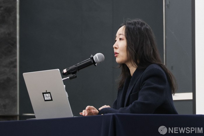 [서울=뉴스핌] 이건주 인턴기자 = 민희진 오케이 레코즈 대표가 25일 오후 서울 종로구 관철동 교원 챌린지홀에서 1심 소송 결과와 향후 계획을 발표하고 있다. 민 대표는 기자회견에서 하이브에 풋옵션 256억 원을 포기할 테니 모든 분쟁을 끝내자고 제안했다. 2026.02.25 kunjoo@newspim.com