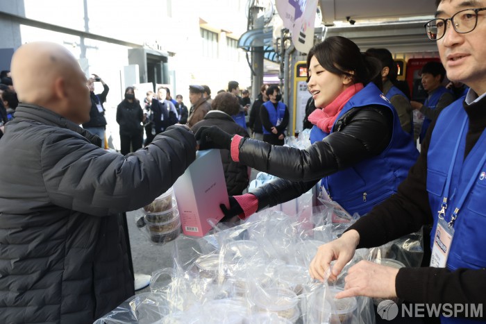 [서울=뉴스핌] 이건주 인턴기자 = 복권홍보대사 겸 행복공감봉사단장인 배우 박하선이 25일 오전 서울 종로구 초동교회 인근에서 봉사단원들과 함께 도시락 및 생필품을 쪽방촌 주민들에게 나누어 주고 있다. 2025.02.25 kunjoo@newspim.com