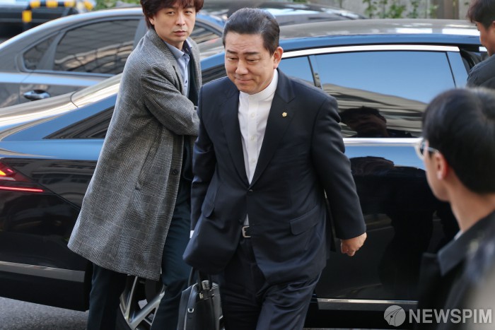 [서울=뉴스핌] 류기찬 기자 = 13가지 의혹을 받는 김병기 무소속 의원이 26일 오전 서울 마포구 서울경찰청 공공범죄수사대에 조사를 받기 위해 출석하고 있다. 2026.02.26 ryuchan0925@newspim.com