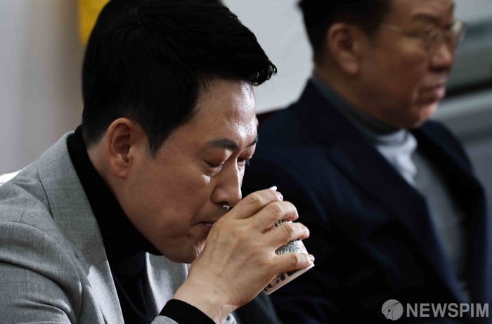 [서울=뉴스핌] 윤창빈 기자 = 장동혁 국민의힘 대표가 26일 오전 서울 여의도 국회에서 4선 이상 중진 의원들과 면담을 하며 음료를 마시고 있다. 이날 장 대표는 중진 의원들과 '절윤' 문제 등 당이 나아가야 할 방향을 논의한다. 2026.02.26 pangbin@newspim.com