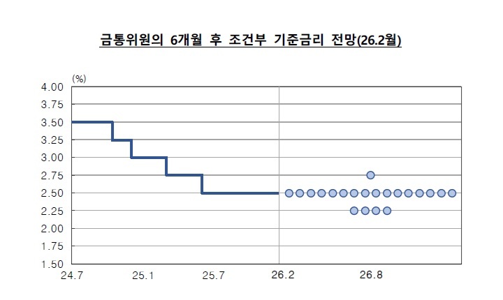한편 한은은 조건부 금리전망(포워드 가이던스) 방식을 개편했다. 기존 3개월 시계에서 6개월 후 전망으로 확대하고, 금통위원 전원이 각자의 금리전망을 3개의 점으로 제시하는 방식으로 바꾸기로 했다. 경제전망을 발표하는 2·5·8·11월 연 4회 제시된다.