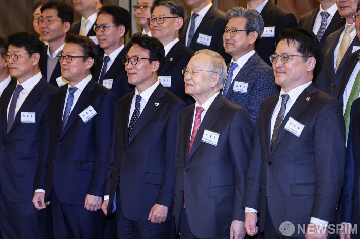 [서울=뉴스핌] 류기찬 기자 = 김민석 국무총리와 손경식 경총 회장을 비롯한 참석자들이 26일 오후 서울 종로구 포시즌스 호텔 서울에서 열린 ‘한국경영자총협회 오찬 간담회 및 K-국정설명회’에서 기념촬영을 하고 있다. 2026.02.26 ryuchan0925@newspim.com