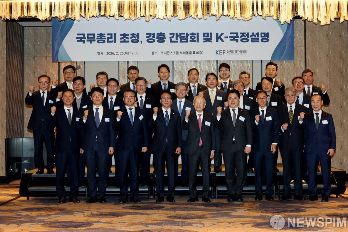 [서울=뉴스핌] 류기찬 기자 = 김민석 국무총리와 손경식 경총 회장을 비롯한 참석자들이 26일 오후 서울 종로구 포시즌스 호텔 서울에서 열린 ‘한국경영자총협회 오찬 간담회 및 K-국정설명회’에서 기념촬영을 하고 있다. 2026.02.26 ryuchan0925@newspim.com