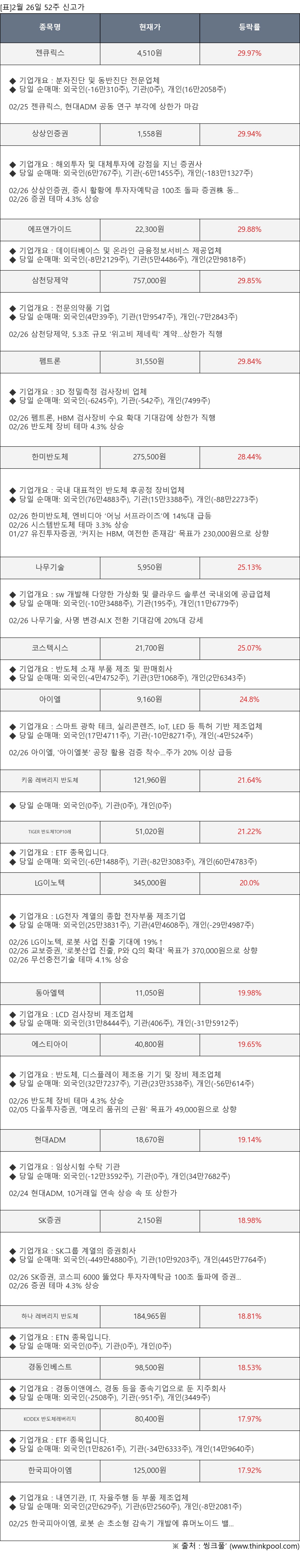 [표]2월 26일 52주 신고가 종목 및 최근 동향