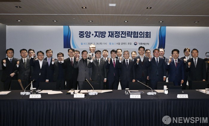 [서울=뉴스핌] 임기근 기획예산처 장관 직무대행 차관이 26일 오전 서울 영등포구 글래드 호텔에서 열린 '중앙·지방정부 재정전략협의회'를 주재, 회의 시작에 앞서 참석자들과 기념촬영을 하고 있다.[사진= 기획예산처] 2026.02.26 photo@newspim.com
