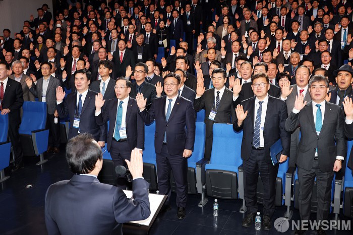 [서울=뉴스핌] 26일 오후 충남 천안시 소재 MG인재개발원에서 열린 다시 성장하는 New MG 새마을금고 비전2030 선포식에서 윤호중 행정안전부 장관, 김인 새마을금고중앙회장 등 참석자들이 공동선언 하고 있다.[사진= 행정안전부] 2026.02.26 photo@newspim.com