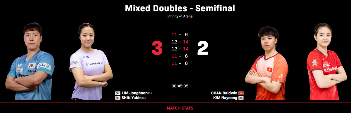 세계랭킹 1위 임종훈-신유빈 조는 26일(한국시간) 싱가포르에서 열린 대회 혼합복식 준결승에서 챈 볼드윈(홍콩)-김나영(포스코인터내셔널) 조를 3-2(11-9 12-14 12-14 11-6 11-6)로 따돌렸다. 2, 3게임을 내주며 벼랑 끝에 몰렸지만, 특유의 집중력으로 짜릿한 재역전승을 완성했다.