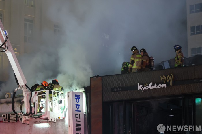 [서울=뉴스핌] 류기찬 기자 = 23일 오후 서울 중구 북창동 먹자골목 상가에서 화재가 발생해 소방대원들이 불길을 진압하고 있다. 2026.02.26 ryuchan0925@newspim.com