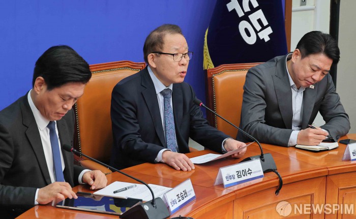 [서울=뉴스핌] 윤창빈 기자 = 김이수 더불어민주당 중앙당 공천관리위원장이 27일 오전 서울 여의도 국회에서 공천 심사 결과 발표를 하고 있다. 이날 중앙당 공관위는 6·3 지방선거 강원도지사 후보로 우상호 전 청와대 정무수석을 단수 공천하기로 했다. 2026.02.27 pangbin@newspim.com