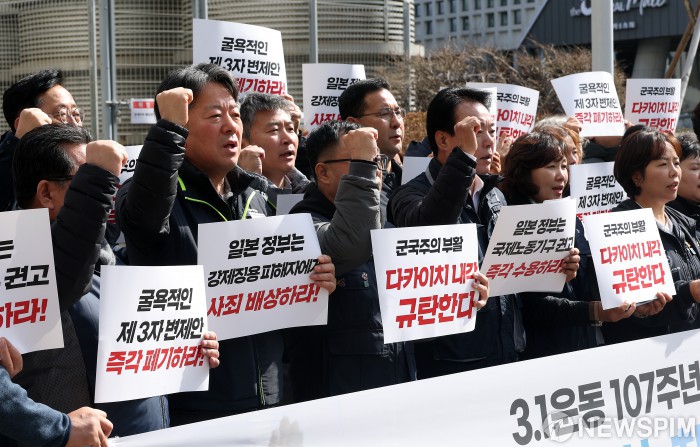 [서울=뉴스핌] 정일구 기자 = 민주노총과 한국노총 등 양대노총 조합원들이 27일 오전 서울 용산구 용산역 강제징용 노동자상 앞에서 3.1운동 107주년 강제징용 노동자상 합동 참배 기자회견을 열고 구호를 외치고 있다. 2026.02.27 mironj19@newspim.com