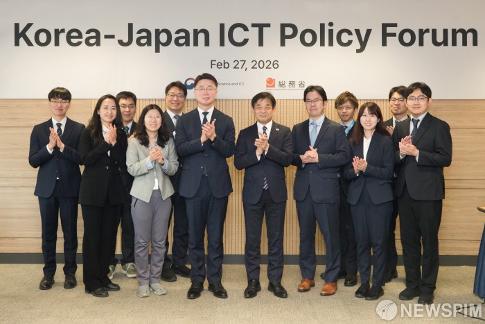 [서울=뉴스핌] 류제명 과학기술정보통신부 제2차관과 이마가와 타쿠오 일본 총무성 국제협력담당 차관이27일 오전 서울 종로구 광화문교보빌딩 국가과학기술자문회의 대회의실에서 열린 '제2차 한-일 ICT 정책포럼'에서 참석자들과 함께 기념촬영울 하고 있다.[사진= 과학기술정보통신부 ] 2026.02.27 photo@newspim.com