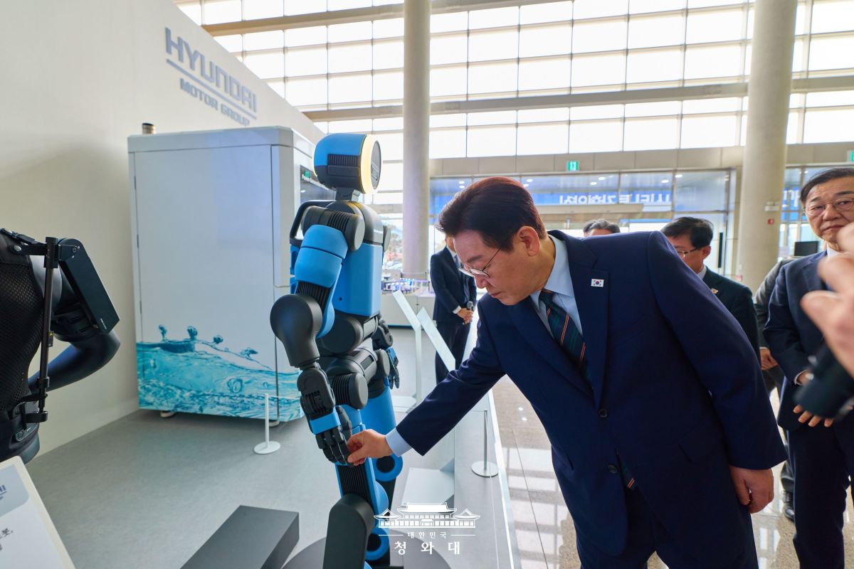 이 대통령은 이어 휴머노이드 로봇과 자율주행 로봇, 안내 로봇, 물류 로봇 등 로봇 전시 구역도 차례로 둘러보며 기술 개발 현황과 상용화 계획을 직접 청취했다.