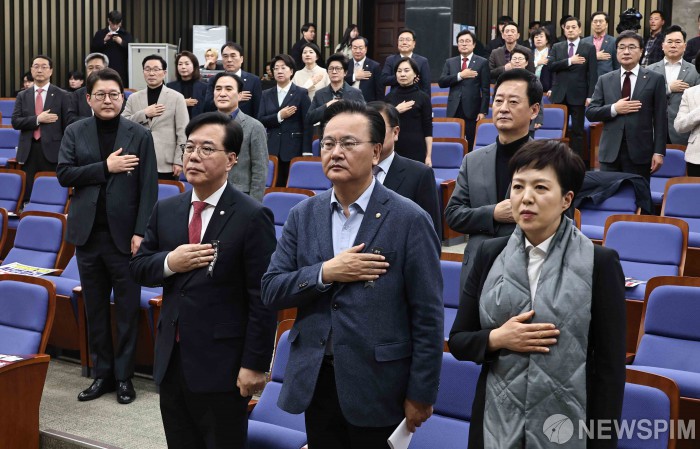 [서울=뉴스핌] 윤창빈 기자 = 송언석 국민의힘 원내대표를 비롯한 소속 의원들이 27일 오후 서울 여의도 국회에서 열린 의원총회에서 국민의례를 하고 있다. 2026.02.27 pangbin@newspim.com