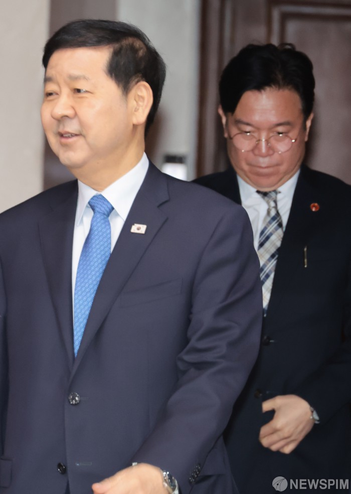 [서울=뉴스핌] 이길동 기자 = 구윤철 부총리 겸 재정경제부 장관(왼쪽)이 4일 오전 서울 종로구 정부서울청사에서 열린 개정 노동조합법 시행 관련 관계장관회의에 김영훈 고용노동부 장관과 함께 참석하고 있다.2026.03.04 gdlee@newspim.com
