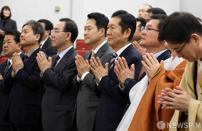 [서울=뉴스핌] 윤창빈 기자 = 정청래 더불어민주당 대표와 장동혁 국민의힘 대표가 4일 국회 도서관에서 열린 2026 국회정각회 신춘법회에 참석해 합장하고 있다. 2026.03.04 pangbin@newspim.com