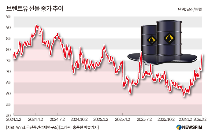 국제유가의 기준점이 되는 브렌트유 선물 가격은 미국의 이란 공격 전날인 지난달 27일 종가(72.48달러) 대비 12.3% 뛴 상태다.