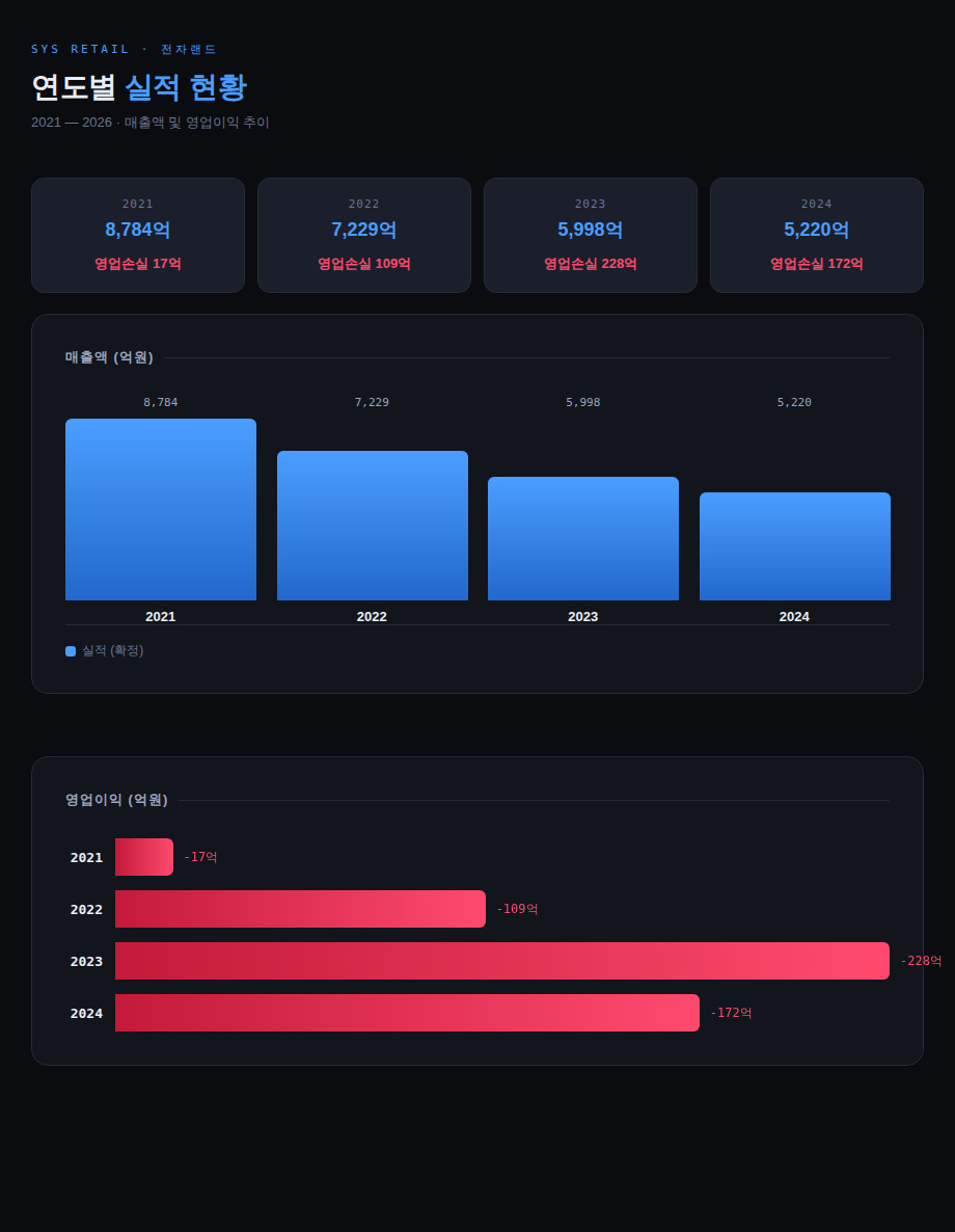 전자랜드가 뷰티 관련 매장 출점을 검토하는 배경에는 가전 시장의 구조적 침체가 자리하고 있다. 전자랜드를 운영하는 에스와이에스리테일(SYS리테일)은 2024년 172억원의 영업손실을 기록했다. 이 회사는 2021년 17억원의 영업손실을 낸 이후 2022년 109억원, 2023년 228억원의 영업손실을 기록하며 4년 연속 적자를 이어갔다. 이 기간 누적 영업손실 규모는 526억원에 달한다.