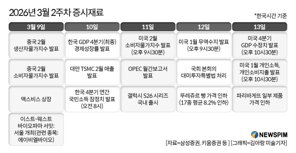 10일에는 한국의 4분기 경제성장률(GDP) 최종치와 연간 국민소득 잠정치가 발표된다. 같은 날 세계 최대 파운드리 업체인 대만 TSMC의 2월 매출도 공개될 예정이다. TSMC 매출은 글로벌 반도체 수요 흐름을 보여주는 지표로 국내 반도체주 투자심리에도 영향을 줄 가능성이 있다.
