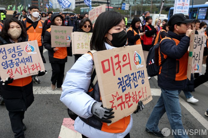 [서울=뉴스핌] 이건주 인턴기자 = 민주노총 조합원들이 6일 오후 서울역에서 '3.8 세계 여성의 날 전국노동자대회'가 열리는 광화문 동십자각 방향으로 행진하며 미국의 이란 전쟁을 비판하는 피켓을 들고 있다. 2026.03.06 kunjoo@newspim.com