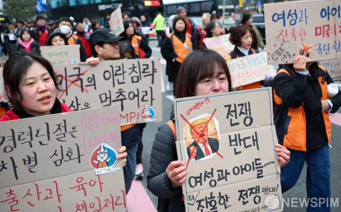[서울=뉴스핌] 이건주 인턴기자 = 민주노총 조합원들이 6일 오후 서울역에서 '3.8 세계 여성의 날 전국노동자대회'가 열리는 광화문 동십자각 방향으로 행진하며 미국의 이란 전쟁을 비판하는 피켓을 들고 있다. 2026.03.06 kunjoo@newspim.com